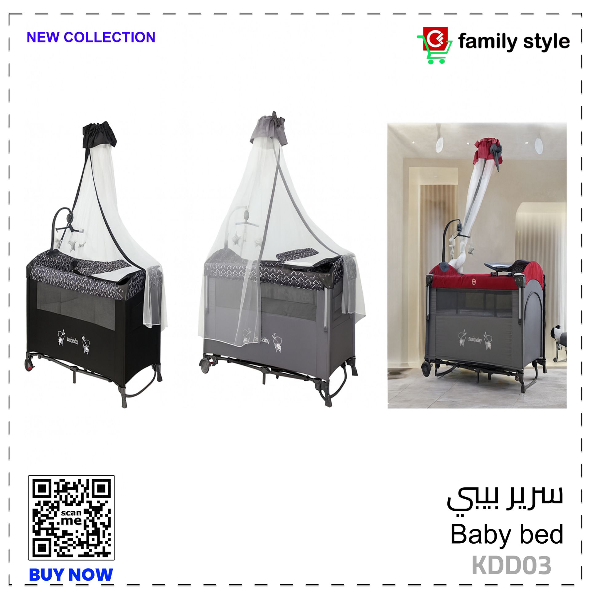 يأتي مع طاولة تغيير حفاضات عملية، ناموسية للحماية من الحشرات، وألعاب معلقة لتحفيز حواس الطفل